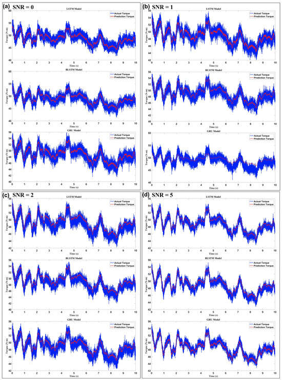 Finally, at 20 dB, the three red traces become practically indistinguishable from the blue baseline; the remaining discrepancies lie well inside the motor-control tolerance of a typical elbow orthosis. Taken together, Figure 6 illustrates key phenomena. First, prediction accuracy improves monotonically with SNR. Still, the improvement is not linear: an enormous performance leap occurs between 2 dB and 5 dB, implying that sEMG features critical for torque decoding emerge from the noise floor within this range. Second, architectural resilience differs. The LSTM consistently exhibits the best noise immunity, the Bi-LSTM offers nearly equivalent performance except for a tendency toward slight overshoot at very low SNRs, and the GRU, while computationally lighter, pays a penalty in both high-frequency jitter and slight amplitude bias. These visual findings align with quantitative metrics reported elsewhere in the manuscript (e.g., RMSE and correlation coefficients) and justify the choice of the LSTM as the torque estimator feeding the hybrid PID loop in the proposed exoskeleton control framework.