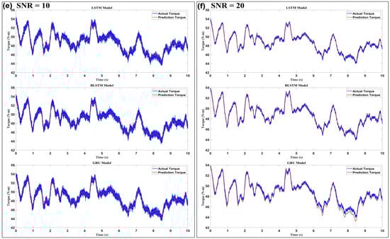 Evaluation of model robustness under varying levels of white Gaussian noise (SNR) ((a) 0, (b) 1, (c) 2, (d) 5, (e) 10, and (f) 20). The plots illustrate the impact of noise on the prediction accuracy of the LSTM, BLSTM, and GRU models, highlighting their generalization capabilities in noisy environments.