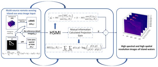The MRA method, on the other hand, does not need to provide training data and is more effective than CS in preserving the spectral features of the original MS images. Given the above problems, in this paper, the MRA method based on scale regression is proposed for the improvement of low spectral retention of island waters with large resolution differences between multi-source sensors, i.e., MTF-GLP-HPM-HSMI based on mutual information hybrid-scale regression method. The hybrid-scale information, including the detailed image with spatial residuals as well as the spectral residuals, is combined and fitted by the mutual information to compute the hybrid weighting coefficients to obtain the final pansharpening results. Experimental results show that our proposed MTF-GLP-HPM-HSMI method outperforms various popular MRA methods in island sea application scenarios. The technical route of this paper is shown in Figure 1.