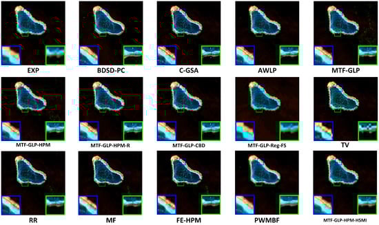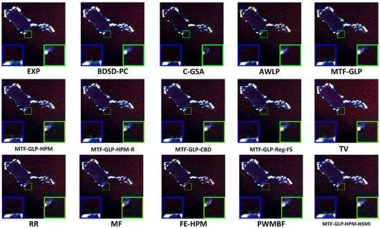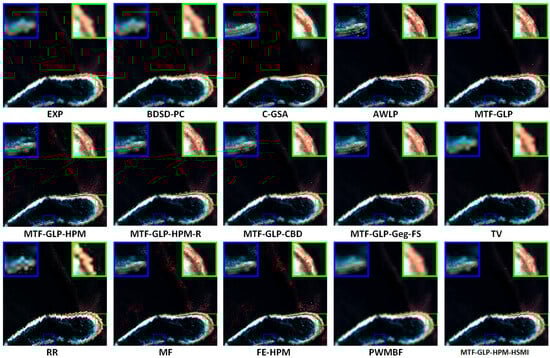 Meanwhile, the magnified regions highlighted by the blue and green boxes indicate that the proposed HSMI method achieves a better balance between spatial detail clarity and spectral fidelity. Methods such as C-GSA, MTF-GLP, and regression-based methods (such as MTF-GLP-CBD and MTF-GLP-Reg-FS) show obvious spectral distortion in island environments, occasionally accompanied by noise artifacts, which may be due to their insufficient handling of the spatial heterogeneity of multi-source data. For instance, C-GSA shows excessive spectral smoothing in the green magnified box of the HG dataset, causing the island edge areas to appear overly green. Other VO-based methods and hybrid methods (such as FE-HPM, PWMBF, etc.) exhibit significant fusion noise on the HY and HG datasets. In addition, the visualization output results of BDSD-PC are inconsistent with the quantitative indicators. Although it performs well in spatial indicators (such as : 0.0053 for the HY dataset), its fused images have halo effects and incorrect contour lines, which leads to the loss of island boundary features. This is in line with the lower value (HY: 0.6926). In contrast, the proposed HSMI in this paper shows clear textures and accurate color restoration in both island edges and lagoon areas, indicating that HSMI can effectively capture the complex features of island and sea scenes. This may be due to its adaptive regression framework, which can better adapt to the spectral and spatial characteristics of Sentinel-2 and Sentinel-3 data.