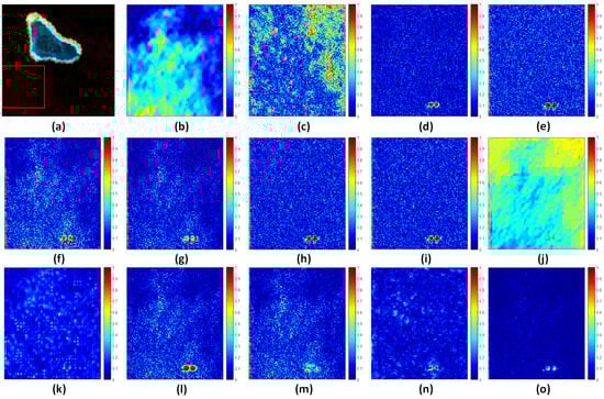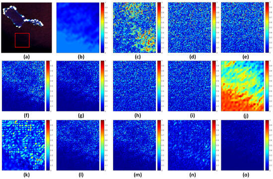 Subareas of full-band SAM average error for HY experiment. From left to right: (a) Selected subregions. (b) BDSD-PC. (c) C-GSA. (d) AWLP. (e) MTF-GLP. (f) MTF-GLP-HPM. (g) MTF-GLP-HPM-H. (h) MTF-GLP-HPM-R. (i) MTF-GLP-CBD. (j) MTF-GLP-Reg-FS. (k) TV. (l) RR. (m) MF. (n) FE-HPM. (o) MTF-GLP-HPM-HSMI.