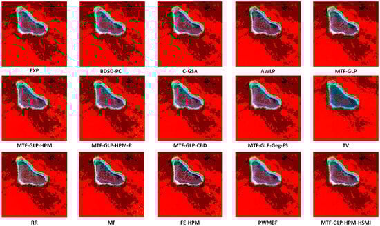 The results of the 4-band fusion of the HY dataset are shown in standard false color (NIR–red–green).