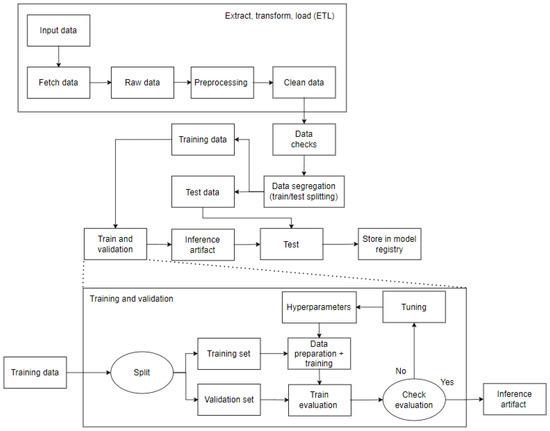 Subsequently, it was necessary to transform all of the knowledge gained from the data during the EDA process, including the earlier processing involved in completing any missing values that the extract, transform, and load process had missed. The dataset was divided into multiple sections during the data segregation phase. Here, a 80/20 ratio was applied. Specifically, 80% of the dataset was designated for the model training and validation, which was saved as a train.CSV artifact. The remaining 20% was set aside for the test, as a model testing.CSV artifact. Notably, the training dataset was split into training and validation sets while it was still in the segregation stage, according to Figure 3.