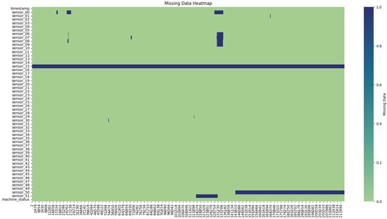 From this information, it can be seen that there were a number of instances where data were absent. For example, sensor 15 had no values, sensor 50 had 34.95% of its data missing, and sensors 00 and 51, which were both missing close to 6–7% of their data, also exhibited this pattern. After removing the prior columns, a missing data heat map was generated to assess the remaining missing values.