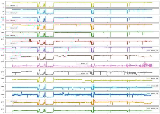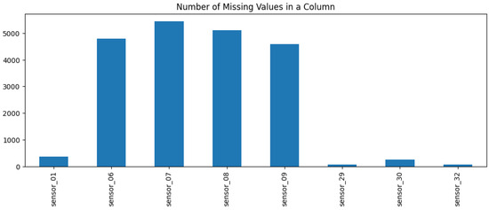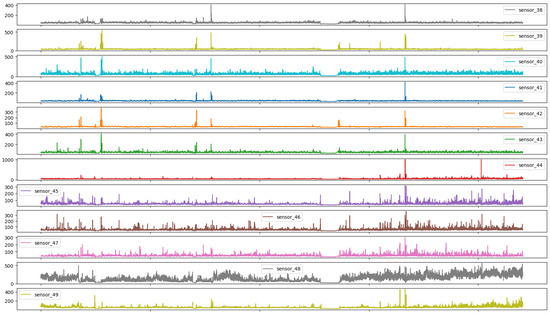 The subsequent phase of the process entailed an examination of the quality of the sensor data, with the objective of repairing the data in a manner that rendered them fit for utilization in training. The initial step was to identify the English acronym for “Not a Number” (NaN) values. This is typically indicative of a sensor that did not transmit any data for a number of reasons, including inadequate maintenance or an issue with the signal itself. It is crucial to distinguish between NaN values and zero values. While zero values may signify a lack of data, the presence of numerous zeros in a dataset indicates a sparse dataset. Upon examination of the data, it became evident that only a few sensors exhibited NaNs, with some sensors displaying a greater prevalence of empty values than others, as illustrated in Figure 4. Furthermore, the problematic data were concentrated in specific regions, allowing for the meticulous filling of NaNs.