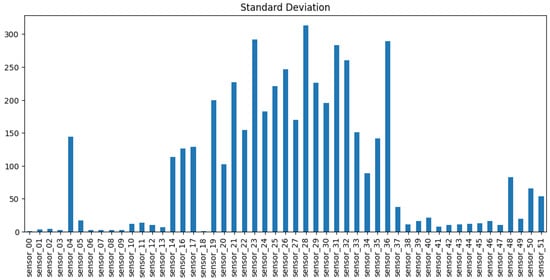 Following the repair, it was evident that sensors 01, 29, 30, 32, and the sensors situated between 06 and 09 exhibited the highest incidence of NaNs, as illustrated in Figure 5. Accordingly, the subsequent step was to examine the standard deviation and variance, which illustrate the extent to which a signal deviates from the mean. This indicates whether a signal is undergoing any kind of movement, and it is therefore essential to identify any trends or changes in the classification. In the highlighted section of Figure 6, the sensors 01, 06–09 do not exhibit a high standard deviation. Consequently, they could be filled with a limit set to 30, representing a maximum of 30 consecutive NaN values.