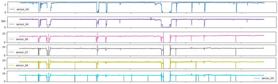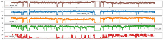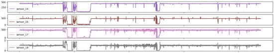 Figure 8 illustrates the loss of signal observed shortly after the central measurement period in the six highlighted sensors. It is notable that these sensors monitored the same variable and exhibited a similar measured behavior within close ranges, with the exception of sensor 04, which had a 25× larger scale. This suggests that sensor 04 may represent the output flow of the entire system.
