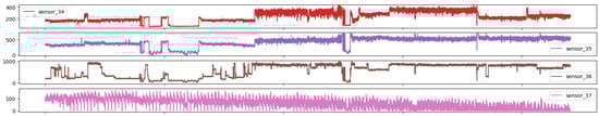 As illustrated in Figures below, the sensors in question typically exhibited a normal recording. The subsequent group represents the recovery phase, which is a logical consequence of the machine suffering an interruption and subsequently recovering. It is notable that only 0.004% of the data had a broken status, which was an acceptable percentage, given that a machine is expected to remain operational for a long period of time. It appears that some sensors exhibited similar behavior despite different scales, and thus it may be beneficial to group sensors based on observed behavior.