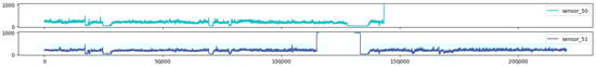 The sensors with the highest concentration of NaNs were sensors 50 and 51. Firstly, sensor 50 malfunctioned at a specific point in time. Two potential courses of action emerged: the complete removal of sensor 50, or the removal of all data from all sensors from time step 140,000 onward. Secondly, both sensors exhibited a similar amplitude and range of values. Moreover, the yellow-marked sections were highly analogous. In other sensors (see Figure 4), the decline at mark 140,000 was evident in the majority of sensors. Sensor 51 also appeared to demonstrate this decline immediately following its data gap. Consequently, the decision was taken to utilize sensor 50 to repair sensor 51.