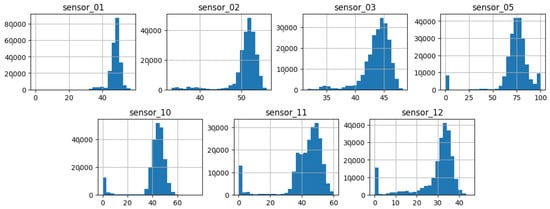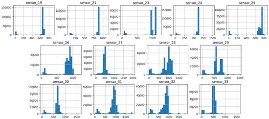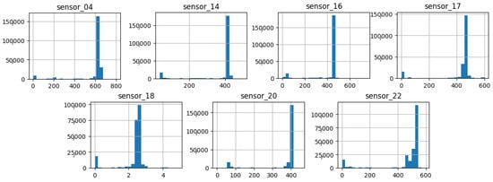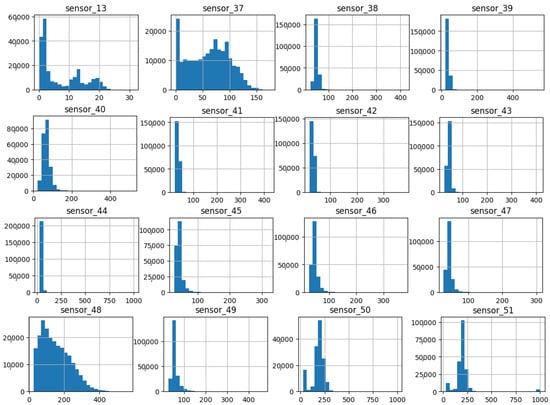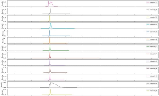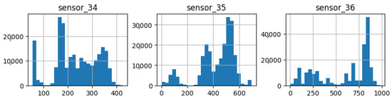 As illustrated in Figure 7, Figure 8, Figure 9, Figure 10, Figure 11, Figure 12, Figure 13 and Figure 14, it is evident that a considerable number of the plotted data points exhibit pronounced fluctuations around the x-marker, with frequencies reaching 40,000–65,000 and 130,000 instances, respectively. As illustrated in Figure 15, the sensor histograms highlight instances where certain sensors exhibited a notable decline in value, while others demonstrated an increase. Additionally, there were instances where sensors that typically maintain a consistent value exhibited a significant variation. These observations suggest that the machine may have encountered a failure and was undergoing a recovery process. This could serve as an indicator for predicting potential failures. This brings us to the next task: addressing the issue of missing data.