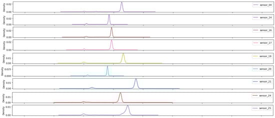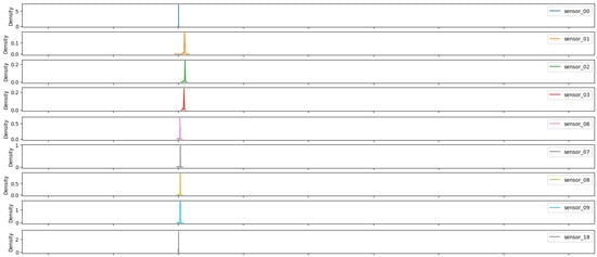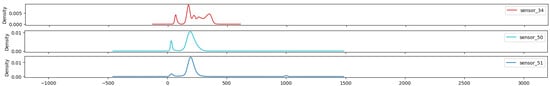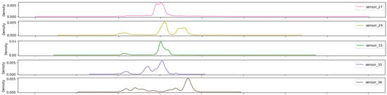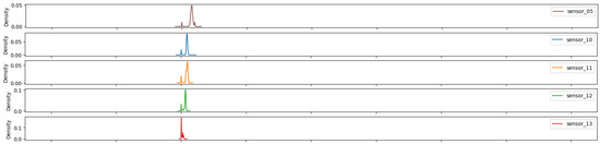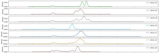 In statistics, the non-parametric method for estimating a random variable’s probability density function (PDF) is referred to as kernel density estimation (KDE). This function features automatic bandwidth determination and makes use of Gaussian kernels, which invariably reduce the amount of error in arriving at the true density. The objective of this work was to achieve adaptive multivariate kernel density estimation [30]. As previously mentioned, some sensor sets showed similar shapes (see Figure 21, Figure 22, Figure 23, Figure 24, Figure 25, Figure 26 and Figure 27).