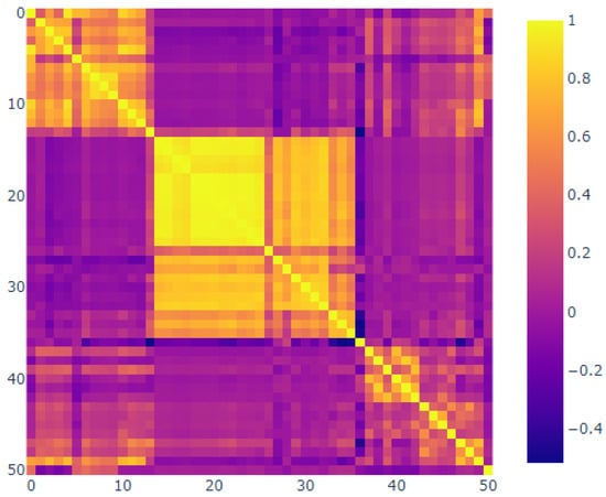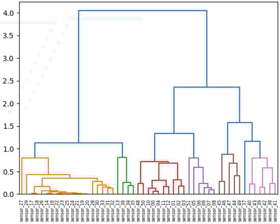 In contrast, sensors 01 through 13 and 37 through 49 demonstrated minimal correlation. Additionally, sensor 37 was observed, suggesting the potential for malfunction over time. It was essential to consider the hierarchical grouping. Figure 29 illustrates the relationship between the distances in the hierarchical clustering and the correlations [32].