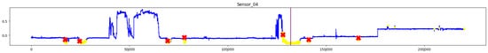 Following the creation of the K-means cluster model, a supervised learning model was constructed which also employed clustering techniques, including K-nearest neighbors (KNN). Two clustering models were selected for the practical application. The project now had a functioning KNN model and its predictions. To facilitate visualization, a single sensor (sensor 04) was utilized, as all normal, recovering, and broken occurrences were occurring simultaneously for all sensors (Figure 31).