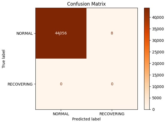 The supervised learning model that was employed exhibited a high degree of similarity to the unsupervised model. As illustrated in Figure 32, the K-nearest neighbor (KNN) model, like the K-means model, only identified normal and recovering clusters. Both models appeared to encounter difficulties in identifying the data points to be clustered. It can be observed that the accuracy, precision, and recall were all equal, which suggests that the model was well-balanced under typical circumstances. However, the test accuracy, precision, and recall values were 0.9998, 0.9998, and 0.9998, respectively. The K-means model achieved a test accuracy of 0.9998, indicating that it was primarily guessing normal. It is probable that the model would have yielded comparable results had it solely guessed normal, given the pronounced imbalance in the data.