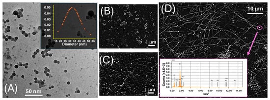 (A) TEM image of LNPs. The inset displays the corresponding Gaussian distribution of the particle diameter, centred around ~30 nm; (B) SEM image acquired in SE mode, highlighting the surface morphology of drop-cast AuLNPs; (C) SEM image acquired in BSE mode on the same sample, enhancing contrast for the high atomic number gold-containing nanoparticles; (D) SEM-BSE image of electrospun PLA fibres functionalized with AuLNPs. The bright spots represent AuLNP distribution across the fibre mat. The inset shows the EDS spectrum collected from the highlighted spot (purple circle): Mα at ~2.12 keV, Lα at ~9.71 keV, Lβ at ~11.44 keV, and Lγ at ~13.38 keV.