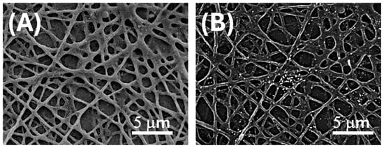 SEM micrographs of electrospun PLA fibres after surface functionalization with AuLNPs via dipping deposition. (A) SE image enhancing the distribution of AuLNPs across the fibre surfaces; (B) BSE image highlighting the presence of gold through bright contrast spots associated with higher atomic number elements.
