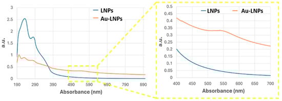 UV–Vis absorbance spectra of LNPs (blue curve) and AuLNPs (orange curve). The inset highlights the visible region (400–700 nm), where the broad absorbance feature of AuLNPs indicates the presence of nanostructured gold through surface plasmon resonance (SPR) effects.