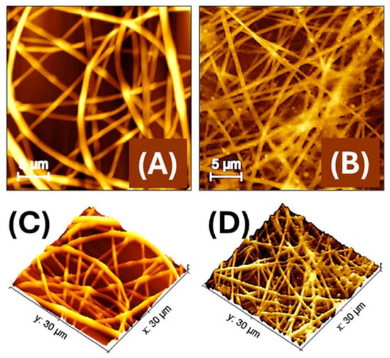 Figure 4C,D show 3D AFM reconstructions of the nanofibre mats before (C) and after (D) dip coating with AuLNPs. More specifically, in Figure 4C, the PLA fibres appear randomly oriented and significantly interwoven, with evident variations in height and some surface irregularities along the fibre axes. The topography reveals a complex, entangled structure, where fibre intersections create uneven elevation profiles. The surface roughness is moderate and primarily intrinsic to the polymer and embedded LNPs.