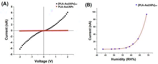 (A) IV curves of PLA-AuLNPs (red) and dipped fibres (PLA–AuLNPs)DIP (black); (B) (PLA-AuLNP)DIP current changes to increasing humidity.