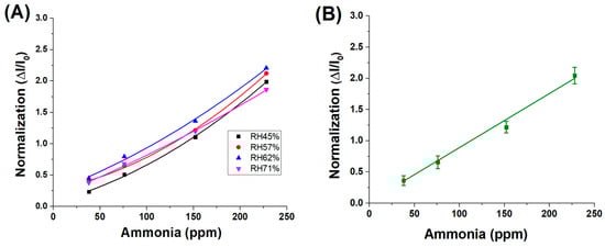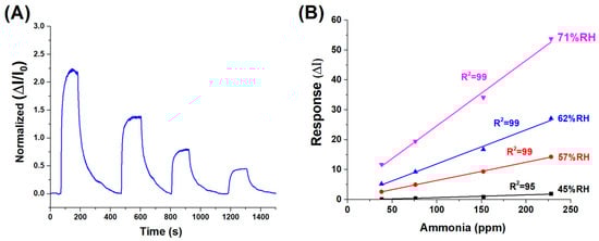 To evaluate the influence of environmental humidity on sensor performance—an effect previously suggested by the results in Figure 6B—a series of measurements were carried out using ammonia concentrations between 230 and 40 ppm under different relative humidity (RH) conditions: 45%, 57%, 62%, and 71%. As illustrated in Figure 7B, the sensor responses at each humidity level were fitted with linear regression curves, yielding slopes of 0.0089 (R2 = 0.95) at 45% RH, 0.0610 (R2 = 0.99) at 57% RH, 0.1138 (R2 = 0.99) at 62% RH, and 0.2189 (R2 = 0.99) at 71% RH. Except for the lowest humidity condition, all data sets exhibited excellent linearity (R2 ≥ 0.99), confirming that both ammonia concentration and ambient humidity significantly influence the sensor’s response.