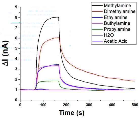 In addition to ammonia, the sensor’s selectivity toward amines and VOCs was evaluated under constant humidity (about 55% RH) and temperature (20 °C) conditions. The sensor’s dynamic response toward various amines and VOCs is depicted in Figure 9. Upon exposure, all analytes induced a rapid increase in current (ΔI), followed by a plateau and a slower recovery phase, indicating fast adsorption kinetics and comparatively slower desorption. Among the tested compounds, methylamine elicited the highest response (~8.5 nA, V:1.5 V), followed by dimethylamine (~6.5 nA), suggesting strong interactions with the sensing material. Moderate responses were recorded for n-buthylamine and ethylamine (ranging from ~3 to 3.5 nA), while propylamine yielded a lower signal (~2 nA), likely due to steric or diffusional effects. In contrast, water vapour and acetic acid produced minimal current variations (~1 nA), underscoring the sensor’s selectivity toward amines and its low susceptibility to humidity or acidic VOC interference. These results highlight the sensor’s potential for selective detection of low-molecular-weight amines.