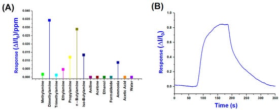 Conversely, Figure 10A shows the normalised sensor responses (ΔI/I0)/ppm to a range of VOCs, including primary, secondary and tertiary amines, as well as potential interferents, such as water, ethanol, acetone, formaldehyde, and acetic acid. Among all the tested analytes, dimethylamine and n-butylamine produced the highest responses, exceeding 3 × 10−2 (ΔI/I0)/ppm, suggesting a high affinity and strong interaction with the sensing layer. According to these results, in evaluating their selectivity index, we can easily calculate a 32.6% response for DMA and a total of 60.1% for the combined response of DMA and n-Butylamine, indicating a preferential sensitivity toward these amines.