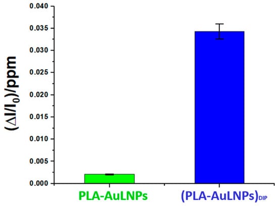 To elucidate the role of AuLNPs in selective DMA detection, sensors with and without external AuLNP functionalization were tested under controlled conditions (20 °C, 56% RH). As shown in Figure 11, the composite (PLA-AuLNPs)DIP sensor displayed a response approximately 17 times higher than that of the PLA sensor encapsulating AuLNPs, confirming the benefit of surface exposure. Error bars indicate good measurement reproducibility.