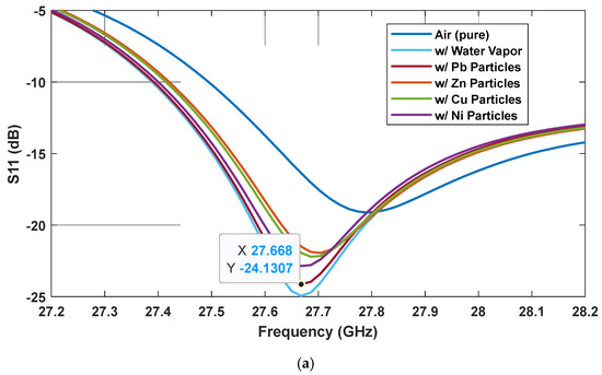 Figure 11 presents S11 parameters from four case studies, with lead pollutants of four different concentration levels, i.e., 0.022, 0.0115, 0.0063, and 0.0032 ppb (parts per billion) in terms of volume, which are 42, 22, 12, and 6 million particles/m3 (or 126.3, 63.15, and 31.58, and 15.79 g/m3, respectively), were used to test the Omni MTM sensor’s performance. The occurrence of the Pb particles can be clearly differentiated by the three resonances at 27.67 GHz, 29.07 GHz, and 33.73 GHz, as shown in Figure 11a. At the first resonance (Figure 11b), S11 from the highest Pb concentration occurs at the lowest frequency with the lowest values. S11 shifts to a higher frequency as the concentration is reduced toward the pure air environment. The S11 behavior is opposite at the second and the third resonances at 29.07 GHz and 33.73 GHz. The sensitivity is lower when the particle concentration is reduced. At 0.0032 ppb, the response nears that of pure air yet is still distinguishable. The detectable threshold of this setting is at 0.0032 ppb. These multiple-point detections significantly boost the sensor’s accuracy.