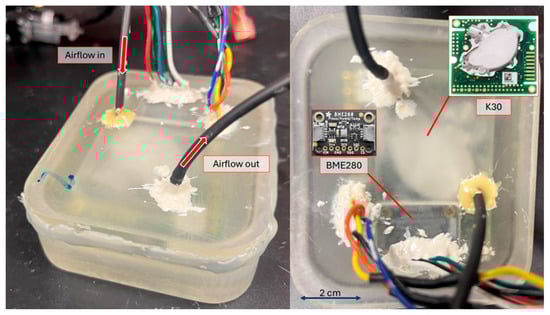 The K30 communicates with a Boron microcontroller (Particle, San Francisco, CA, USA) over universal asynchronous receiver transmitter (UART) serial communication, which logs the readings to a micro-SD card on an Adalogger FeatherWing RTC + SD board (Adafruit, NYC, USA). All logged data can be downloaded from the micro-SD card by removing it from the Adalogger after deployment.