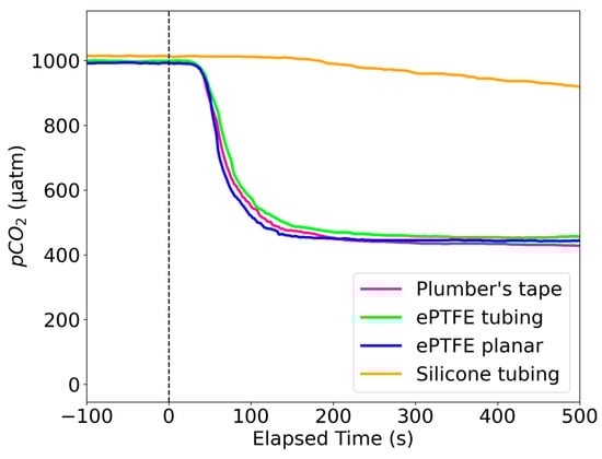 During the development process, the response times of several different potential diffusion membranes were evaluated by flooding a chamber with a known concentration of CO2 and observing their response (Figure 3). The ePTFE (tubing 250 µm thick; planar 900 µm thick) had one of the fastest response times and higher durability than regular PTFE plumber’s tape (approx. 80 µm thick), so we chose it for our diffusion membranes. The silicone tubing we tested had a wall thickness of about 280 µm.