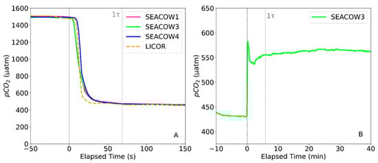 (A) The response of the SEACOWs air side to a step change in pCO2 occurring at time 0. Note that the x-axis has been limited to 150 s in order to emphasize the response within 1τ, as opposed to the full 5τ response. (B) The response of the SEACOW to a step change in aquatic pCO2 at time 0.