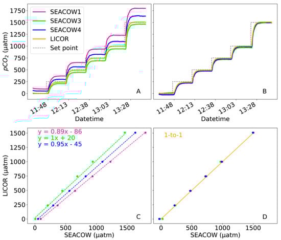 (A) Stepwise gas experiment of all four SEACOWs vs. the LI-COR LI-850 prior to applying the dry calibration curves. LI-COR LI-850 XCO2 measurements were converted to pCO2 for comparison. The dotted gray line represents the CO2 concentration set points throughout the experiment. (B) Stepwise gas experiment after applying the dry calibration curves. (C) The averages of the last 5 min of each ‘”step” plotted against their line of best fit, or the dry calibration curve, which are labeled using matching color. Error bars indicating standard deviation within the final five minutes were excluded from (C,D) due to being smaller than the markers and, therefore, not visible, so the data presented in these two panels can be found in table form in Appendix C. (D) The averages of the last 5 min of each “step” after applying the dry calibration curve. The orange 1-to-1 line is plotted using the data from LICOR averages as the x and y values.