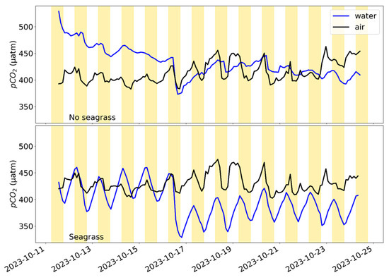 Equilibrated pCO2 end points plotted for the air (black) and water sides (blue) for the tanks with and without seagrass, as labeled. Yellow background signifies “daytime,” or when the aquarium lights are illuminated, and white background signifies “nighttime,” or when lights are turned off.