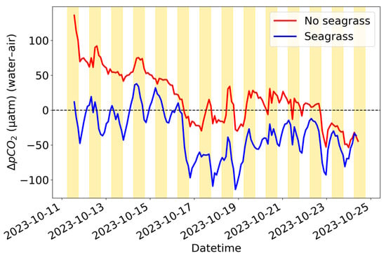 The difference between the averaged equilibrated water-side values and the air-side values was taken to produce ∆pCO2 values (Figure 7). From 11 October to 16 October, the ∆pCO2 values were as expected, with the seagrass tank seeing more consistent diel cycling, with values decreasing throughout the day and increasing through the night. Additionally, because the atmospheric pCO2 values from both SEACOWs matched closely (Figure 6), most of the differences between the ∆pCO2 values of each tank can be attributed to the aquatic pCO2.