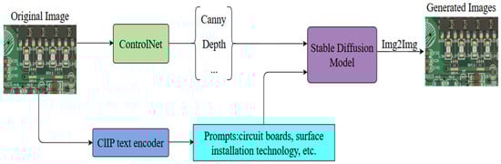 As the PCB surface patch component soldering defects dataset has less variety in actual production, which is not enough to support deep learning model training, it needs to be expanded. The commonly used expansion method is to use the adversarial generative network (GAN) [30] for expansion, but this experimental dataset is a non-independent sample, there will be more than one surface patch component target in the sample image, which will contain both normal and defective component welding detection targets, and the adversarial generative network cannot be applied to expand the dataset. In this experiment, the ControlNet-based stable diffusion model is used to expand the dataset, and its structure is shown in Figure 1 below. Firstly, Contrastive Language-Image Pre-training (CLIP) [31] is utilized to extract sample key cues from the input sample images. The textual cues are then encoded and input into the latent space, where they are fused with the features in the latent space to further control the model output. The cue words are selected to be re-injected into the stable diffusion model to assist the cueing of Img2Img with the higher-frequency cue words. At the same time, ControlNet is utilized to extract key features from the input image and feed them to the stable diffusion model for additional control over the output image. Ultimately, the stable diffusion model generates an expanded sample image that closely resembles the original input image with respect to its logical distribution and spatial layout, which are visually very similar to each other but very different at the pixel level. As illustrated in Figure 2 below, Figure 2a and Figure 2b show the input sample image and generated sample image, respectively, while Figure 2c represents the pixel-level differences between them. In addition, the generated image does not need to be re-labeled with an annotation tool, and its label information can be shared with the original image, significantly reducing time and labor costs.