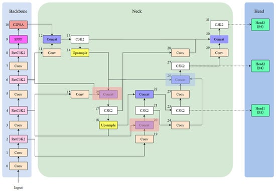 The complete framework of the improved YOLO11n is illustrated in Figure 3 below. As the experimental results have shown, the YOLO11n “https://docs.ultralytics.com/zh/models/yolo11” (accessed on 10 February 2025) detection network exhibits limited performance in the detection of PCB surface patch electronic component soldering defects, such as the detection of a variety of target types, different scales, and the more complex background dataset detection performance is insufficiently sensitive to small target detection and it is easy to miss the detection. To address these limitations, we improve the C3K2 module in the backbone combined with Retention Block to RetC3K2 module. Additionally, we improve the original neck network to a multi-branch auxiliary neck network.