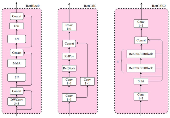 The C3K2 module is an important and efficient feature extraction component in the YOLO11n model, which is improved on the basis of the design structure of the traditional C3 module by introducing multi-scale convolutional kernels and adopting a channel separation strategy, enabling the model to capture contextual information in a larger range and enhances the ability of feature extraction in complex scenarios and deep-level tasks. However, the original C3K2 module relies solely on a purely convolutional stacking structure, which is computationally efficient and stable for training, but it lacks flexibility, with branches fixed to bottleneck layers and limited receptive fields, and is unable to dynamically adjust the receptive fields. Its localization limitation is also large and lacks global dependency modeling capability. Furthermore, the original C3K2 module performs poorly when processing datasets like PCB surface patch component soldering defects, which are detected with smaller targets, more target types, and complex and dense backgrounds. To address this issue, we introduce Retention Block (RetBlock) into the C3K2 module, upgrading it to the RetC3K2 module. RetBlock introduces dynamic retention of attention based on the local perception of traditional convolution. Through the coordinated design of convolution and attention, local–global feature cooperative modeling is achieved and the accuracy of small target detection is improved. RetBlock, with its structure illustrated in Figure 4, first employs Depthwise Separable Positional Convolution (DWConv) to inject local positional information, thereby enhancing the model network’s ability for the recognition of low-level feature details. Subsequently, Manhattan Self-Attention (MaSA) [14], as the core component of RetNet, mainly utilizes the dynamic spatial attention mechanism to strengthen the ability of the model to capture the global context and improve the accuracy of small target detection. Finally, the nonlinear transformation is introduced through a feed-forward network (FFN) to further enhance feature representation.