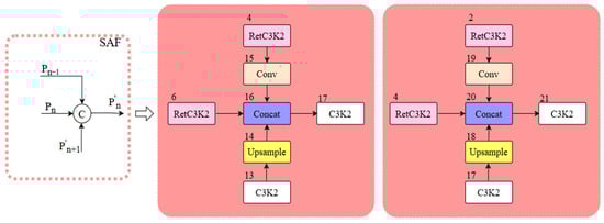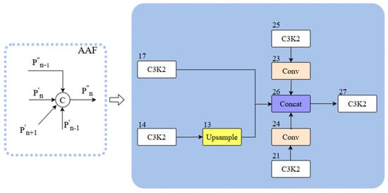 To address the aforementioned issues, we integrate the original neck network with the Multi-Branch Auxiliary FPN (MAFPN) structure and propose the multi-branch auxiliary neck network structure. The MAFPN primarily consists of Surface Auxiliary Fusion (SAF) and Advanced Auxiliary Fusion (AAF). The SAF structure diagram is illustrated in Figure 5, where Pn−1, Pn, and Pn+1 mean feature maps with various resolutions; Pn represents the feature layer of the backbone structure, and P′n and P″n denote the two paths of the MAFPN. We integrated the SAF structure into the two Concat modules (numbered 16 and 20, indicated by light red boxes in Figure 3). The main role of the fused SAF structure is to integrate the features of the deep layer information with the same-layer and high-resolution shallow layer within the backbone structure with each other through cross-layer hopping connections and to retain the shallow layer information as an auxiliary branch into the deeper network to enhance the performance of detection for a small target. The AAF structure is illustrated in Figure 6, which combines the aggregated layers across the shallow high-resolution layer P′n+1, the superficial low-resolution layer P′n−1, the similar superficial layer P′n, and the previous layer P″n−1 that are integrated with each other to produce output P″n. We fuse the AAF structure into the Concat module (number 26, indicated by the blue box in Figure 3). The fused AAF structure can simultaneously merge feature information from four different layers, enabling the output layer to retain comprehensive multi-scale information and thereby improving the performance of medium-sized target detection.