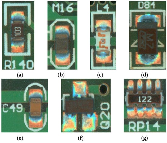 Images of mounted electronic components: (a) resistor; (b) thermistor; (c) inductor; (d) diode; (e) capacitor; (f) triode; and (g) potentiometer.
