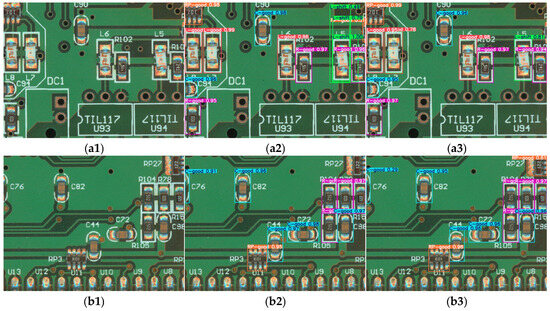 In Figure 8 we list some soldering defect detection results of PCB surface mount electronic components with the improved YOLO11n model and the original YOLO11n model; Figure 8(a1–a3) show the original picture of our experimental test, Figure 8(b1–b3) show the original YOLO11n model’s detection results on the test images, and Figure 8(c1–c3) show the detection results of the improved YOLO11n model on the test images. It can be intuitively found that the original YOLO11n model is prone to misdetection or missed detection in the face of the complex detection background based on multiple detection objects, such as the misdetection of the offset inductance as multiple targets in Figure 8(c1), the missed detection of the voltage divider in the upper-right corner of Figure 8(c2), and the missed detection of the voltage divider in the middle of Figure 8(c3) due to the appearance of some complex holes in the background around it. Compared with our improved YOLO11n detection method, our method effectively addresses the above misdetection and missed detection while maintaining high detection accuracy.