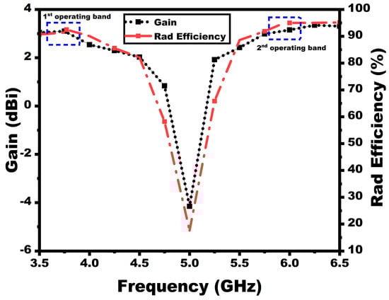 The suggested antenna has progressively evolved in four stages to achieve the prescribed dual bands. The antenna modeling starts with a rectangular patch antenna, which provides scattering parameters below −10 dB. The second stage incorporates two rectangular slits in the radiator. The antenna operates at 5.62 GHz in this stage with a very low bandwidth of 5.6–5.64 GHz. To provide a dual-band response, the third stage is introduced with two L-shaped strips in the radiator. This stage showed two bands below −6 dB from 3.09–3.19 GHz and 5.9–6.04 GHz. Although the antenna gives a two-band response, the bandwidth is very low. To incrementally increase the antenna bandwidth with a dual-band response below −10 dB, the antenna ground is made partial with a rectangular cut towards its center. Reducing the antenna ground is a well-known technique for improving the bandwidth by reducing the antenna quality factor. The rectangular cut, on the other hand, provides better impedance matching. The suggested last stage exhibits a dual-band operation with resonating at 3.75 GHz and 5.9 GHz, respectively, and spans from 3.68–3.85 GHz to 5.84–6.06 GHz. Figure 2 depicts the suggested single-element antenna’s reflection properties at various stages. The antenna offers gain and efficiency of 3 dBi/90% and 3.6 dBi/93% for the first and second bands, as illustrated in Figure 3.