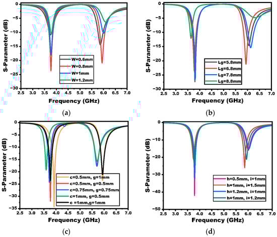 The antenna dimensions are optimized using parametric analysis, where the major antenna parameters are analyzed to achieve the desired dual-band response. The feed width (W), ground plane length (Lg), thickness of L-shaped strips, and dimensions of the rectangular cut in the ground are optimized. The corresponding reflection coefficients are compared as shown in Figure 4. The optimal values of the design parameters are finally chosen, providing the desired bandwidth. As exhibited in the figure, the feed width is chosen to be 0.8 mm. Improving the antenna bandwidth is greatly impacted by reducing the ground length. The size of the ground is optimized, and a value of 6.8 mm is chosen which provides a wider bandwidth and requisite frequency of resonance. The widths of L-strips have been a crucial parameter for achieving the desired frequency bands. The width of each branch of the L-strip is chosen as 1 mm, as provided in the figure. The width and height of the rectangular cuts in the ground plane have contributed to good impedance matching. These parameters have also been crucial in achieving a wider bandwidth and frequency of operation for the second band. The height and width of the rectangular cuts are optimized to a value of 1 mm and 1.2 mm, respectively.