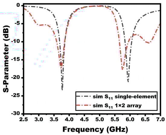 The reflection coefficients of the proposed single-element antenna and array antenna are compared in Figure 6. As discussed earlier, the single element has a bandwidth of 3.68–3.85 GHz and 5.84–6.06 GHz. The array antenna, on the other hand, provides bandwidth from 3.59–3.84 GHz to 5.65–5.95 GHz, resonating at 3.75 GHz and 5.76 GHz, respectively. In the array antenna design, there is a slight resonance frequency variation towards the second band due to the alteration of the ground. However, the antenna still operates in the desired frequency range of operation.