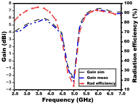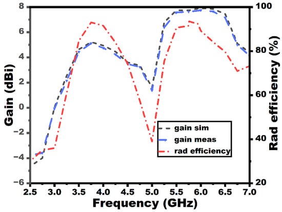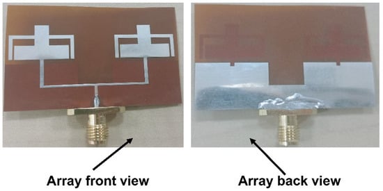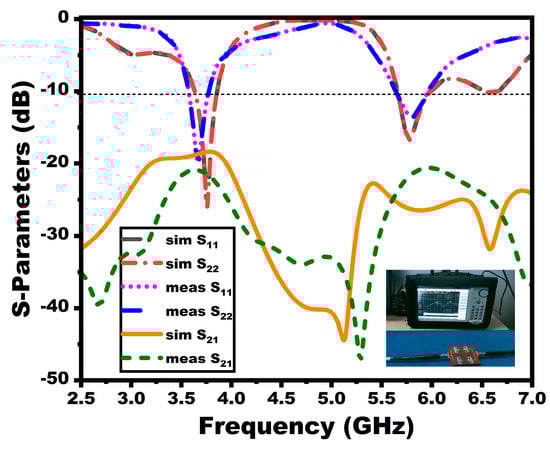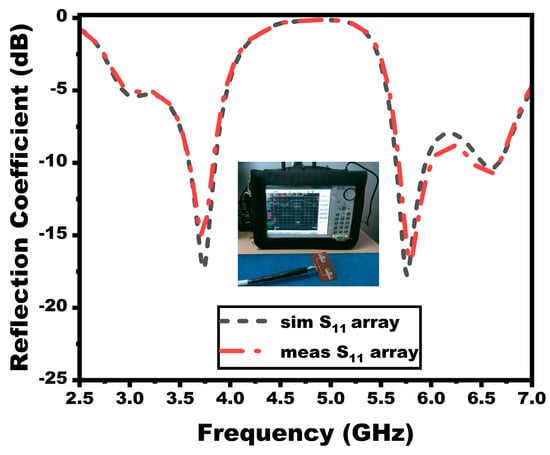 As is apparent from Figure 7, the array antenna is constructed on a flexible polyimide substrate. The Anritsu S820E VNA (Atsugi, Japan), which operates in the frequency range of 1 MHz to 40 GHz, is used to measure the scattering parameters of the suggested antenna. Figure 8 shows the reflection coefficient between the simulated and evaluated findings of the suggested array antenna. The array antenna provides a dual-band response with a 3.59–3.83 GHz to 5.68–6.01 GHz operating range.