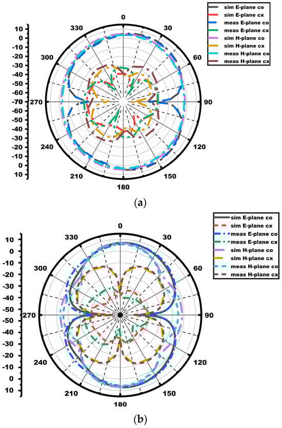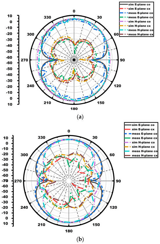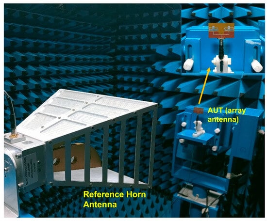 The radiation characteristic evaluation of the array antenna using the anechoic chamber is given in Figure 9. A double-ridged horn antenna (18 GHz) is utilized as a reference antenna while the fabricated array antenna is used as the AUT (antenna under test). The 2D radiation patterns (co- and cross-polarization) at the major E and H planes at the resonant frequencies 3.75 and 5.76 are given in Figure 10.