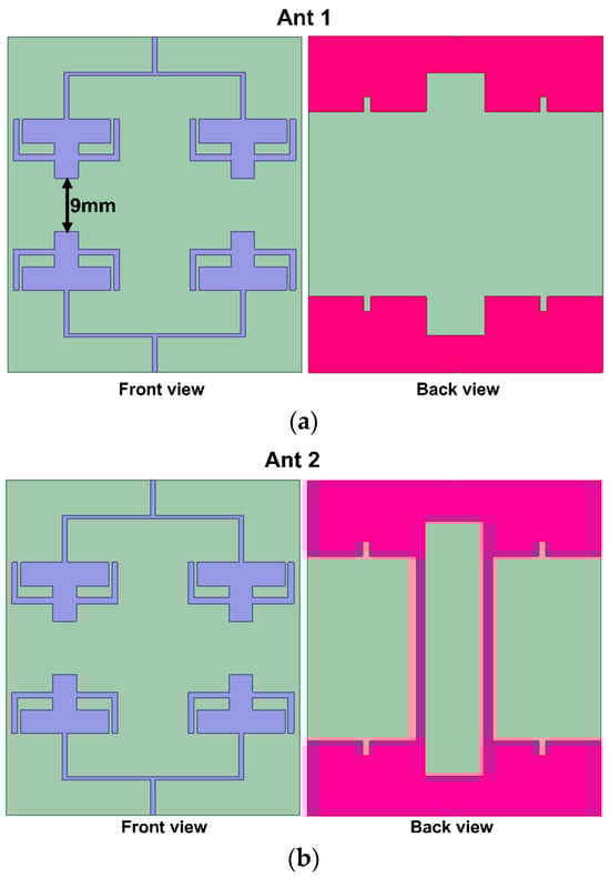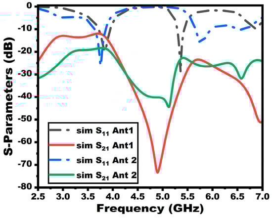 The proposed 1 × 2 array antenna, discussed in Section 3, is extended to a two-port MIMO array antenna, as shown in Figure 12. Initially, at stage 1 (Ant 1), the MIMO configuration is formed by mirroring the 1 × 2 array antenna towards the x-axis at an element spacing of 9 mm (less than one-fourth of the wavelength) as shown in Figure 12a. The second stage (Ant 2) shows the final proposed MIMO antenna incorporating two vertical stubs that form the entire connected ground and DGS decoupling structure. Figure 13 displays the simulated scattering properties of the MIMO configuration’s evolution stages. From the figure, the reflection coefficient of the first evolution stage has a reduced bandwidth and frequency of operation.