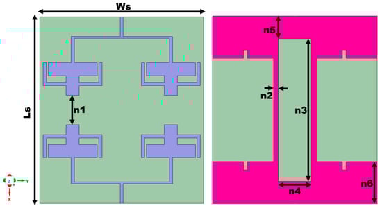 Schematic of the MIMO array antenna. All values in mm: Ls = 57, Ws = 50, n1 = 9, n2 = 1.5, n3 = 43.4, n4 = 10, n5 = 6.8, and n6 = 12.8.