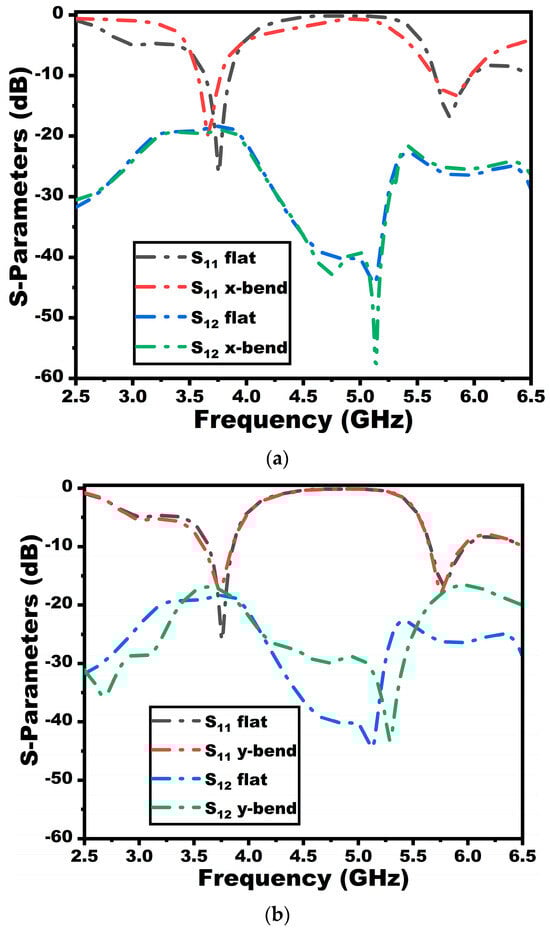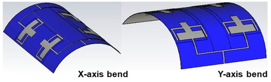 One of the prominent analyses involving the design of the antenna for wearable scenarios is the bending analysis. The performance of the antenna changes when the antenna is kept in a bent position according to the human body’s curvatures [6]. To study the performance of the antenna in a bending environment, the proposed antenna is analyzed with two different bending conformations (x-axis and y-axis bends) with a 50 mm radius of bend, as portrayed in Figure 15. The analysis is performed using cylindrical bends available in the CST Studio EM tool. The S-parameters of the antenna are observed under both the bending axis and compared with the performance under flat conditions, as evaluated in Figure 16. It is evident that under both scenarios, there is a slight shift in the resonance in the first band, whereas the second band does not show any variations. The bandwidth in both bands is also retained, showing the antenna’s applicability in wearable applications.