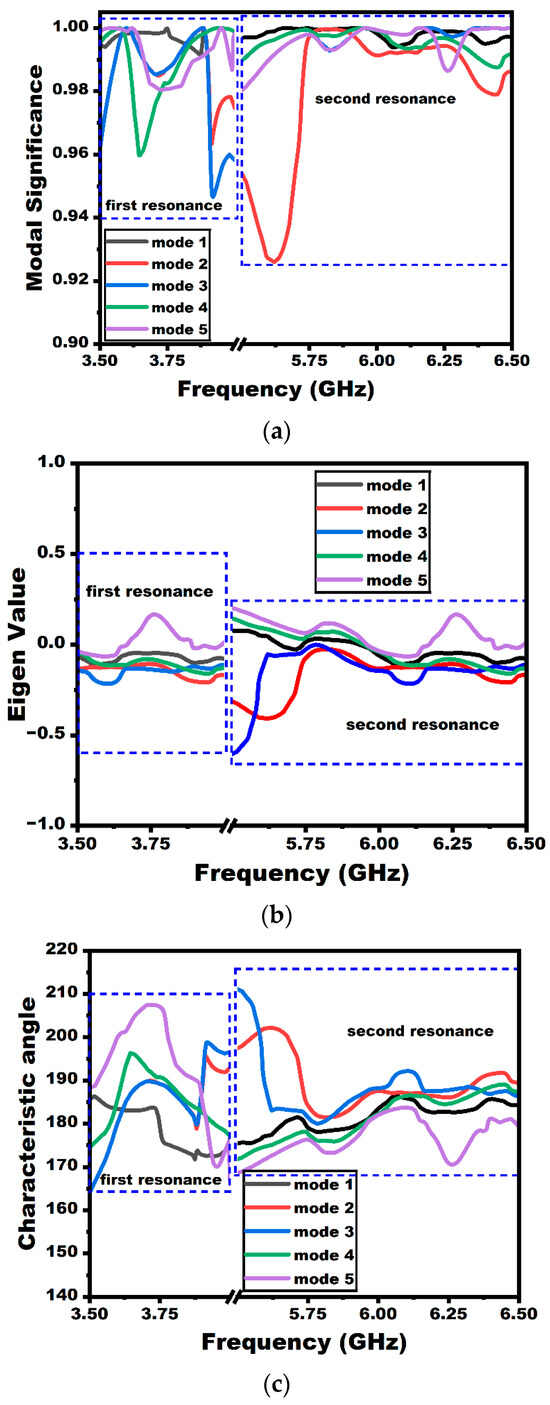 The eigen-based parameter’s modal significance (MS) and characteristic angle (CA) are investigated in the study to understand the resonance behavior of the proposed antenna. The CA determines the corresponding field current phase delays. In contrast, the modal significance indicates the normalized current mode value, where a mode resonates when the MS value is near unity. In other words, the particular mode resonates when the eigenvalue is zero or the CA is close to 180°. Figure 17 shows the CMA parameters of the suggested MIMO antenna at both resonances. The study uses the first five fundamental modes (modes 1–5) to examine the antenna’s resonance behavior. Initially, let us consider the first resonance. From the figure, the first resonance of the antenna is highly influenced by mode 1, since the modal significance approaches unity and the eigenvalue of that particular mode is zero. This can be further confirmed by the CA value, where the value approaches 180° for the first mode. The individual current modes contribute to the resonance when the MS value is more than 0.707 [20]. Even though all the other modes contribute to a value higher than 0.707, mode 1 is the most significant mode that helps in radiating energy and contributes much to the first resonance. In addition, it can be deduced from the figure that every mode contributes to the second resonance of the suggested antenna, which has an MS greater than 0.707. However, it is visible that modes 1 and 4 are more significant and contribute to the second resonance with an MS value equal to unity near the second antenna resonance and also over the entire second band of operation. The CA value also approaches 180° for these two modes, indicating the antenna’s radiation.