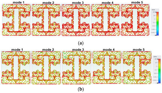 Surface current distribution of CM modes: (a) first resonance and (b) second resonance.